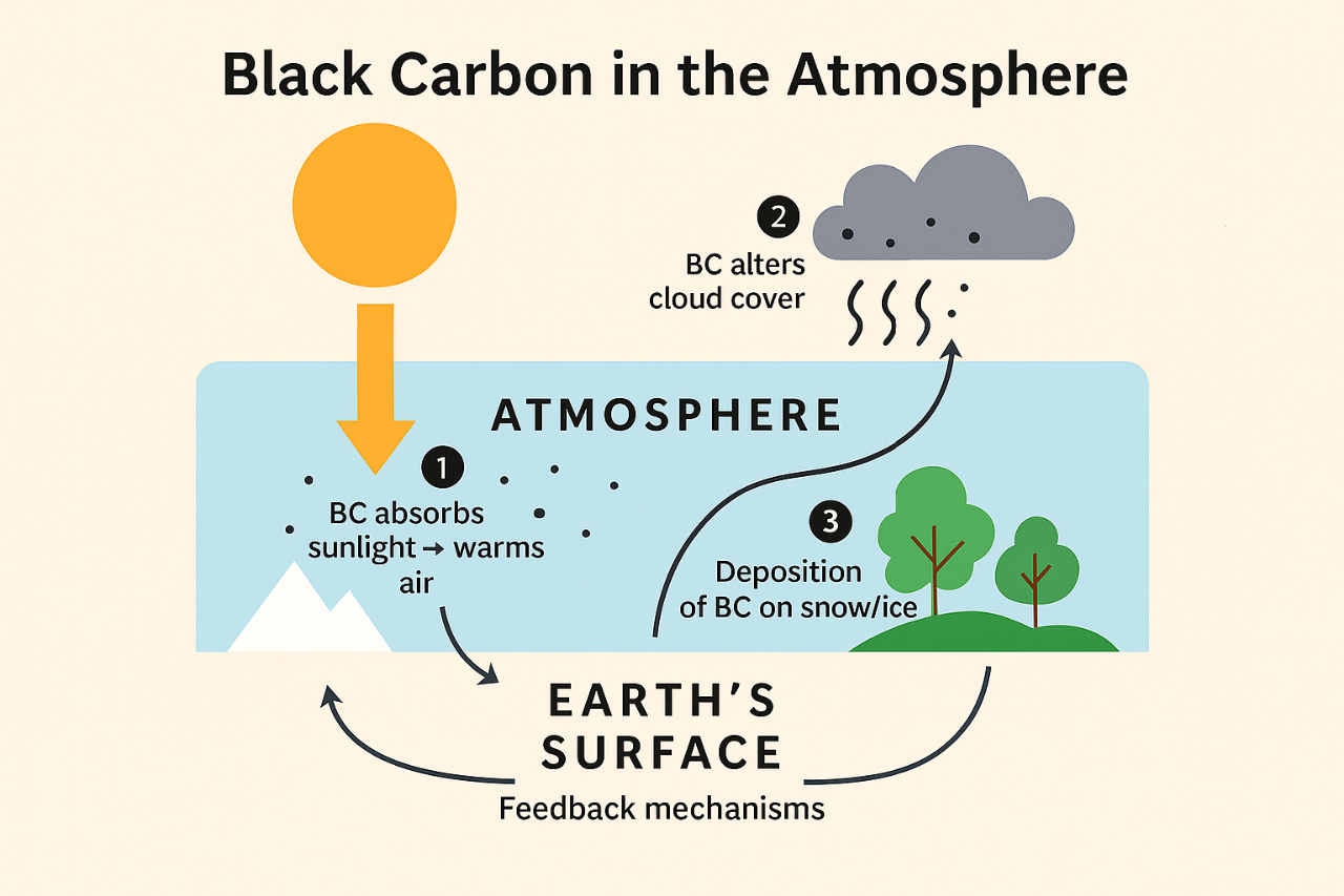 Černý uhlík patří mezi krátkodobě znečišťující látky (short-lived climate pollutants), které v klimatickém systému setrvávají jen pár dní, ale na jednotku hmotnosti ohřívají atmosféru mnohem silněji než oxid uhličitý (CO2). Podle World Economic Forum ohřívá černý uhlík atmosféru téměř 1500x více než CO2. Důvod je zřejmý, černý uhlík pohlcuje sluneční záření v celé jeho vlnové šířce od záření viditelného až po infračervené a je tak po CO2 druhým nejvýznamnějším antropogenním faktorem aktuální změny klimatu. Na sněhové pokrývce a ledu snižuje černý uhlík albedo (množství odraženého záření) a tím významně urychluje tání. Dnes se už modely a studie shodují, že černý uhlík potlačuje tvorbu oblačnosti a zvyšuje tak množství záření procházející atmosférou až k povrchu, mění se teplotní profil atmosféry, cirkulace, a tedy i srážkové procesy. Studie Clean Air Fund doporučuje opatření v dopravě, domácím vytápění a vaření, průmyslových zdrojích (např. cihelny), flaring v ropném a plynárenském sektoru, aby se minimalizovaly klimatické i zdravotní dopady černého uhlíku.